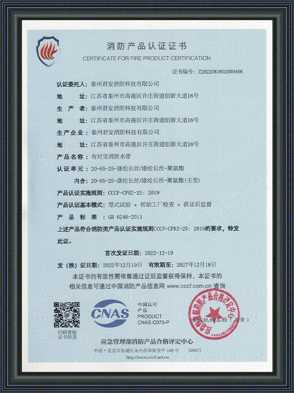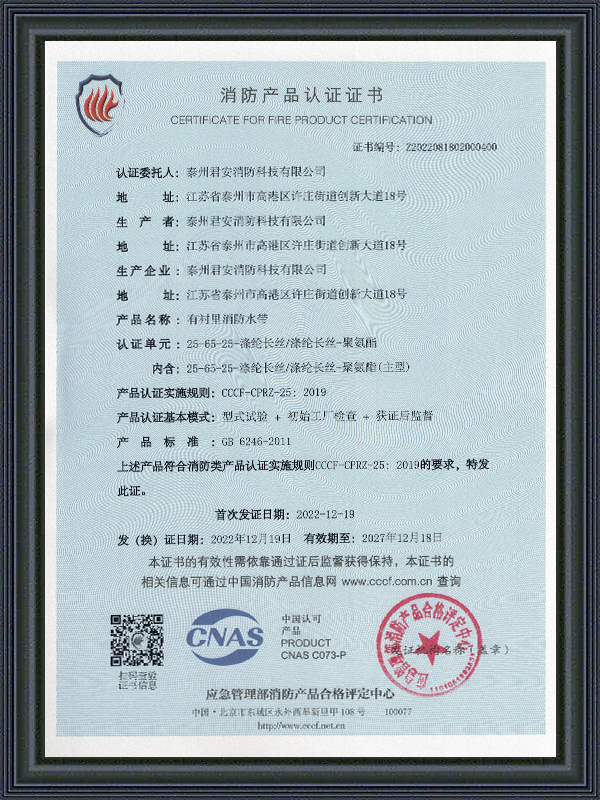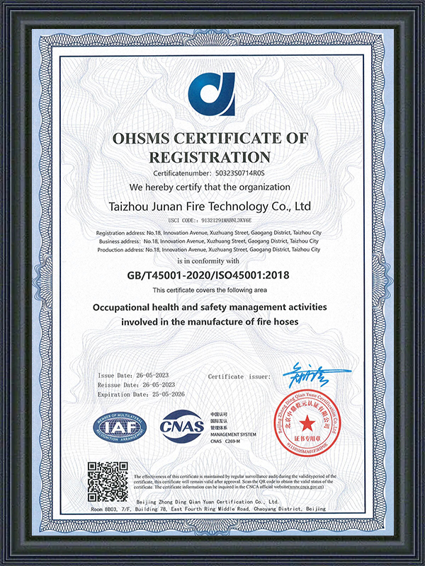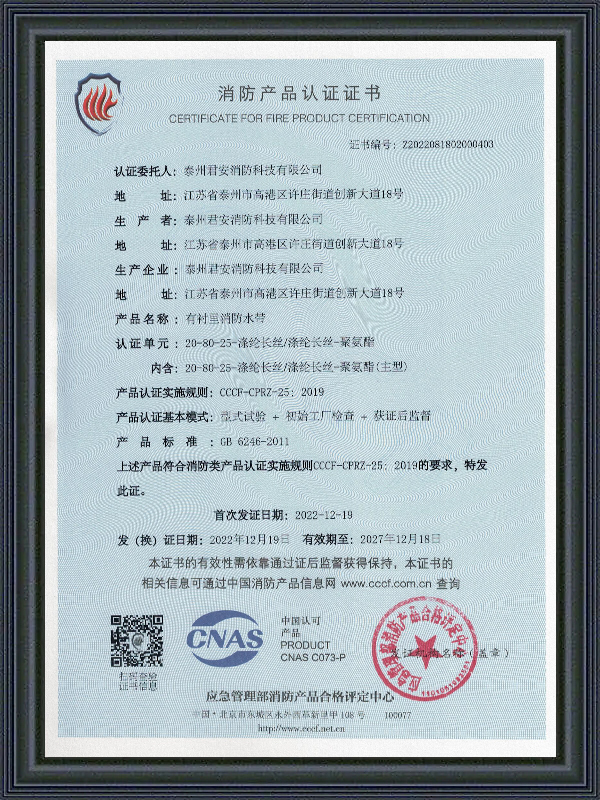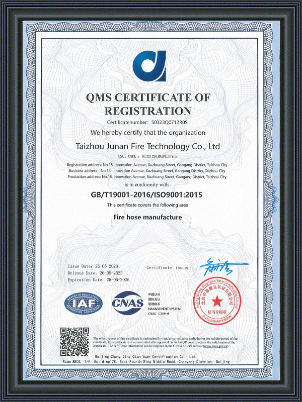 すべての Jun'an ホースは CE、CCC、および FM グローバル規格に準拠しており、重要な状況における信頼性を保証します。